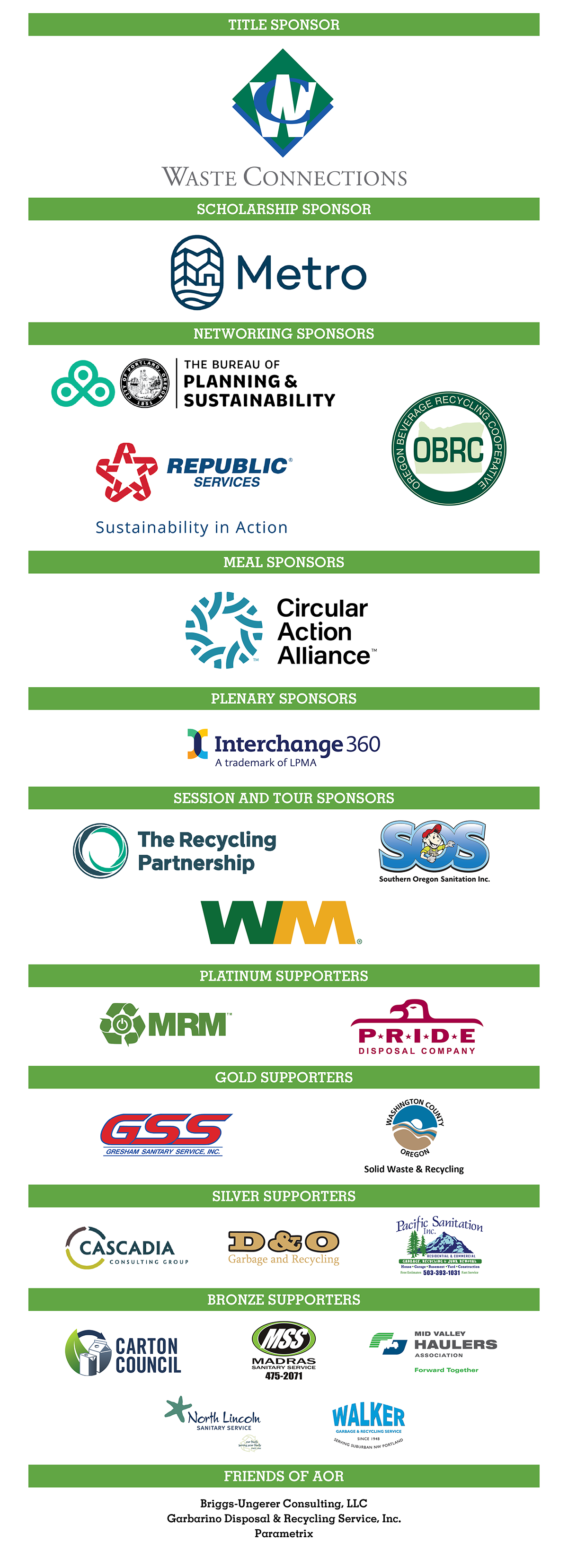 Sustainable Oregon offers an array of sponsorship opportunities that not only promote your organization but also demonstrate your commitment to AOR and the growth of the materials management industry in Oregon.