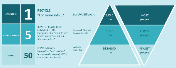 When it comes to education, it’s tempting to make the most of every opportunity to address every detail of what, when, where and how to recycle. But honestly, only a few folks would welcome that level of detail. Most would feel overwhelmed. To keep your outreach at the right level of detail, just remember 1 : 5 : 50.